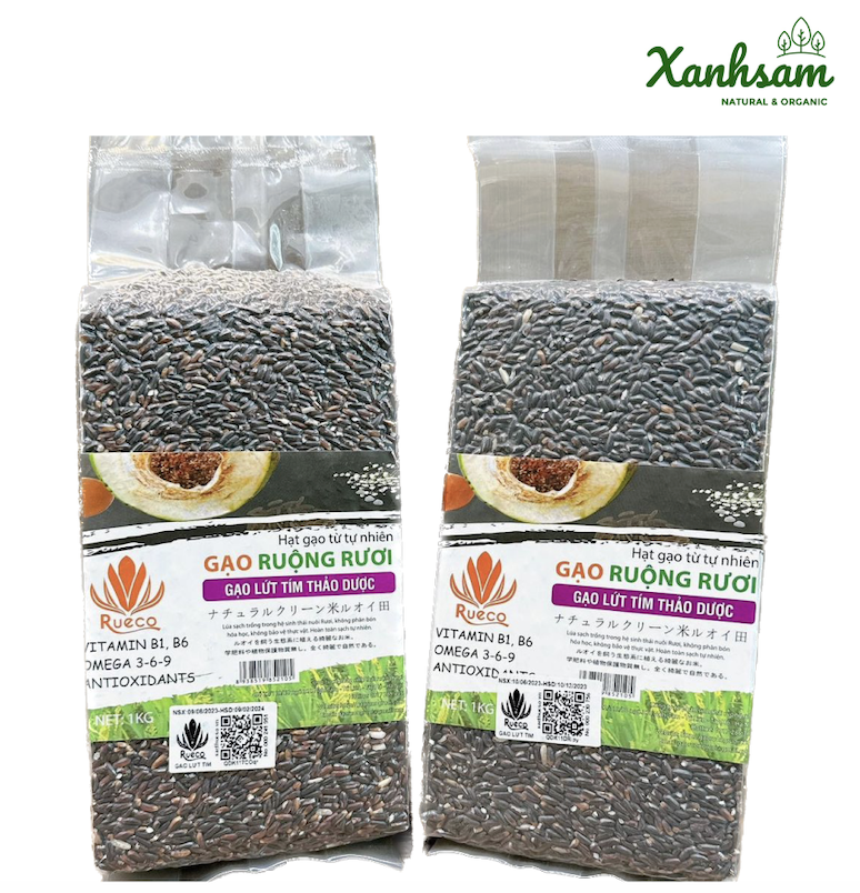- Gạo lứt tím thảo dược Ruộng Rươi dược được trồng không phân bón hóa học, không phun thuốc trừ sâu, là một loại gạo dẻo cơm, thơm ngọt, chứa nhiều vitamin, giàu cám trong lớp vỏ lứt giúp ngăn ngừa xơ vữa mạch máu, giảm cholesterol.