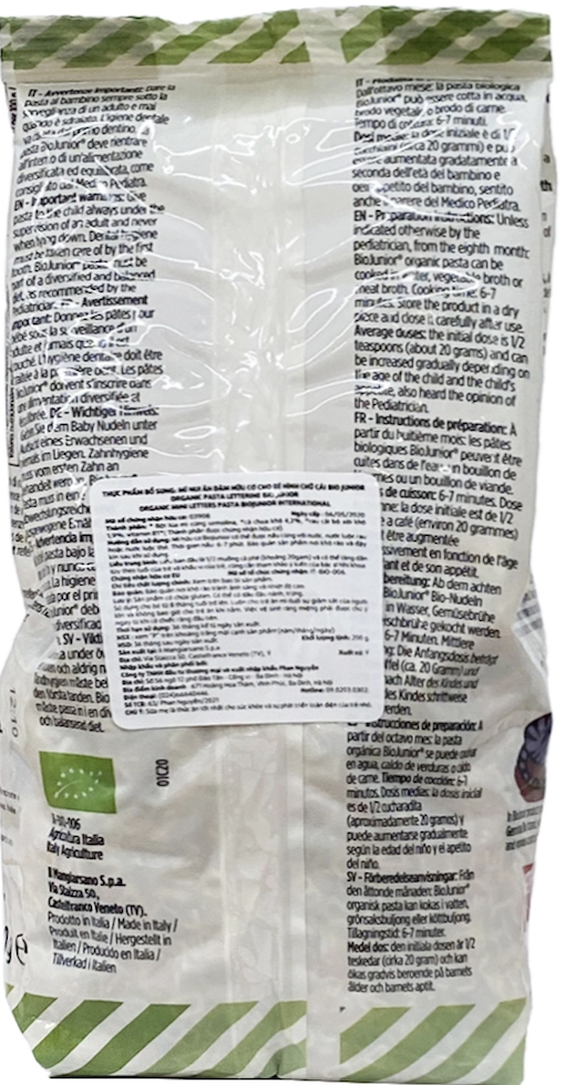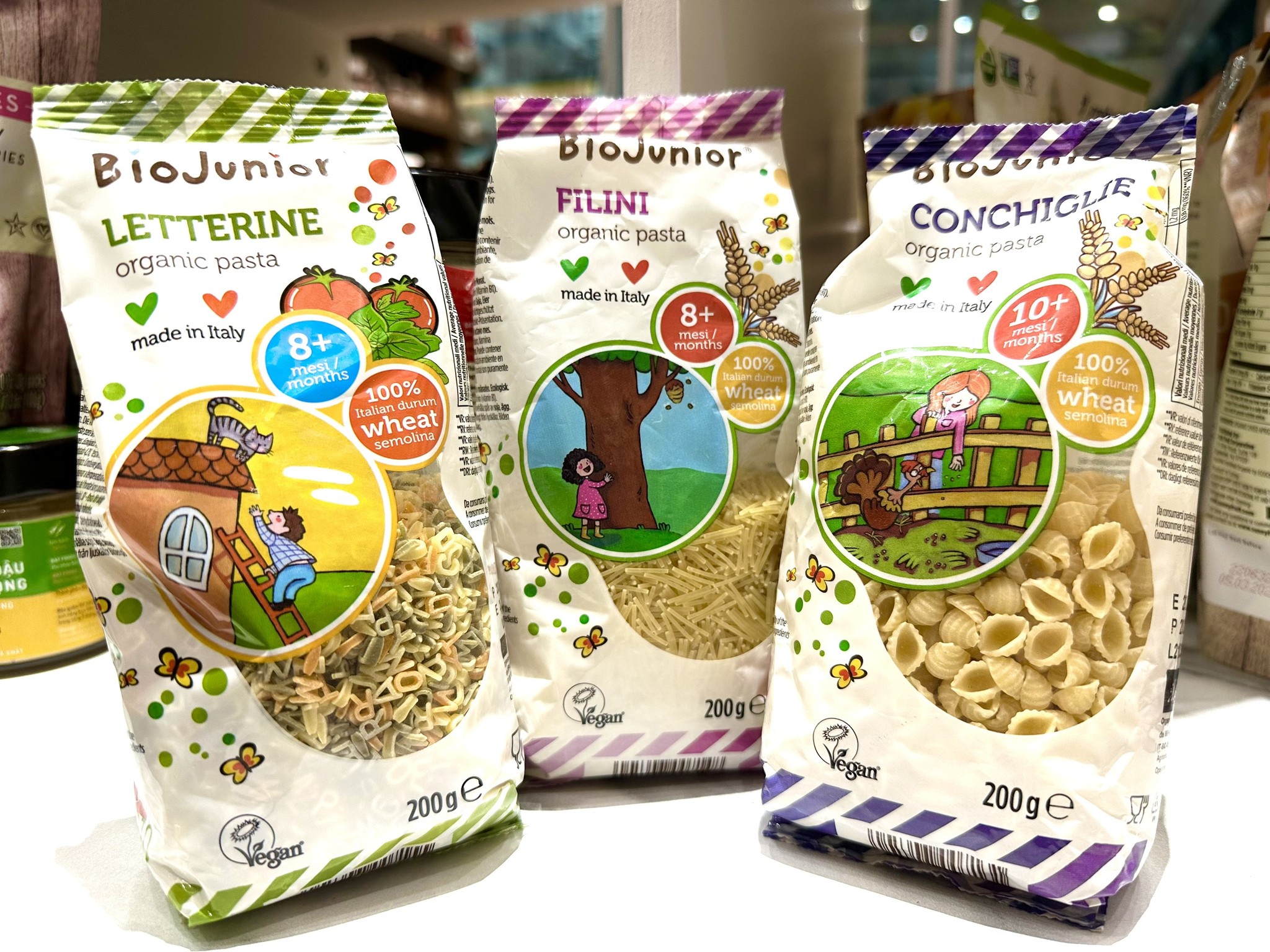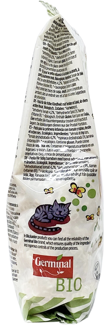 Thành phần: Bột lúa mì cứng semolina, cà chua khô 4,2%, rau cải bó xôi khô 1,9%, vitamin B1.