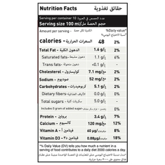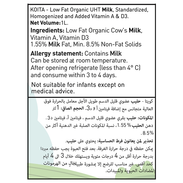 Thành phần: Sữa bò hữu cơ ít béo, Vitamin A, Vitamin D3, 1,55% chất béo sữa, tối thiểu 8,5% sữa khô tách béo.