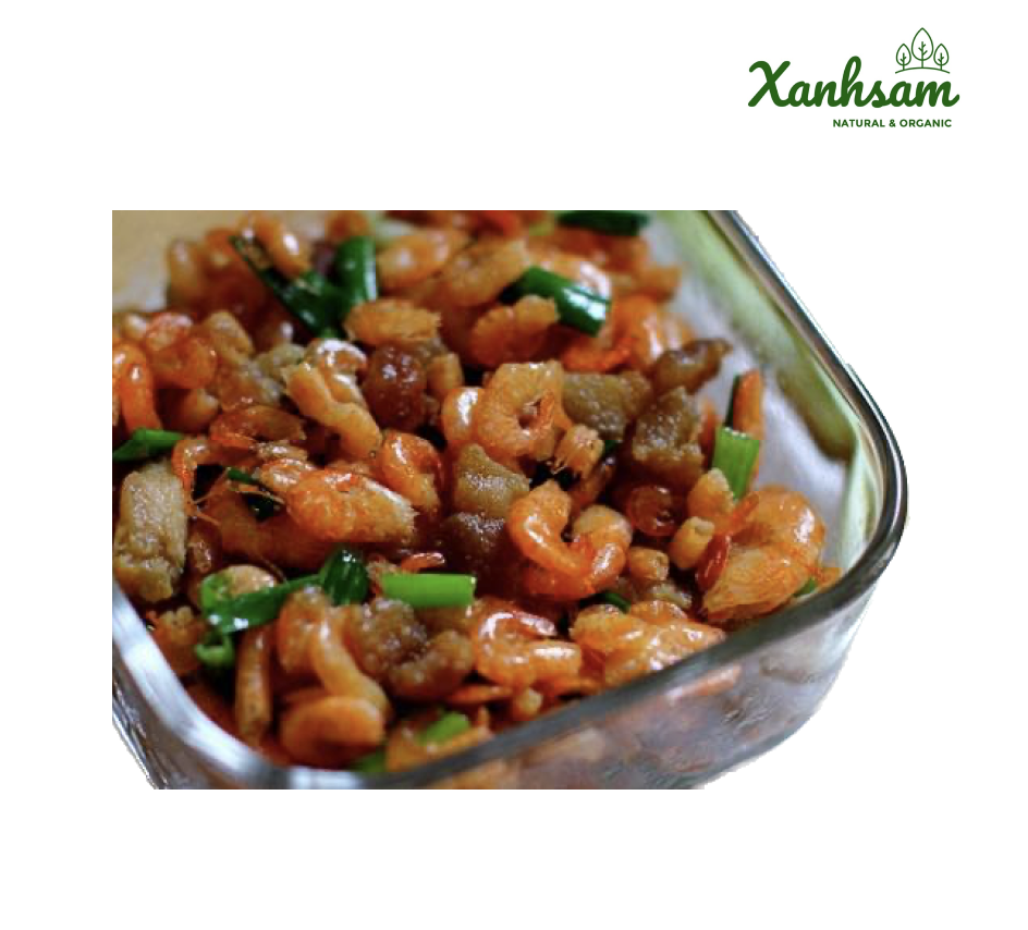 - Phi thơm tỏi với dầu cho thơm rồi trút tôm vào đảo cho đến khi tôm chín và chuyển màu vàng thì cho thịt vào, đảo đều cho chín. Nêm thêm 1 thìa cà phê hạt nêm, đường, hành khô băm nhỏ vào cho thơm, đảo lên.